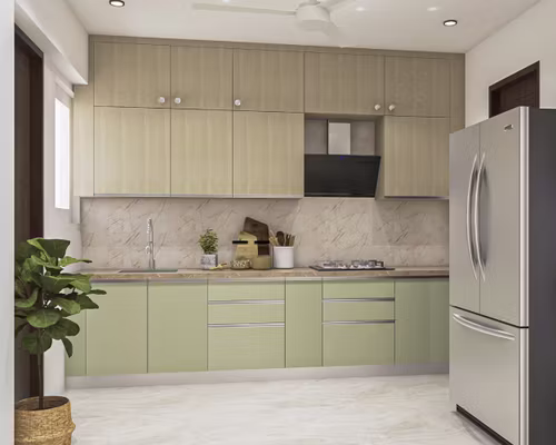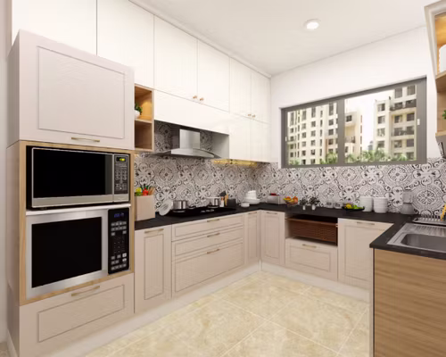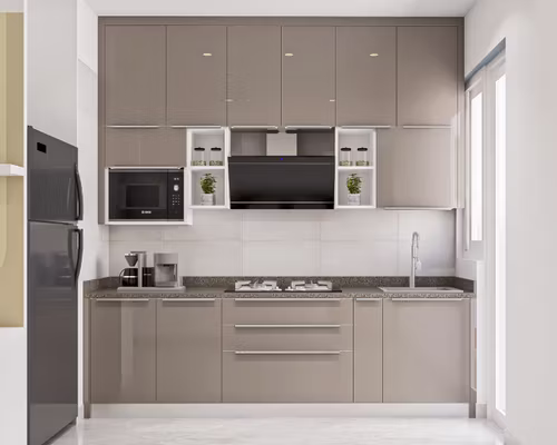 Contemporary L-Shape Modular Kitchen Design in Sand Satin and Lavender Size: 12x11 feet Book Free Consultation
